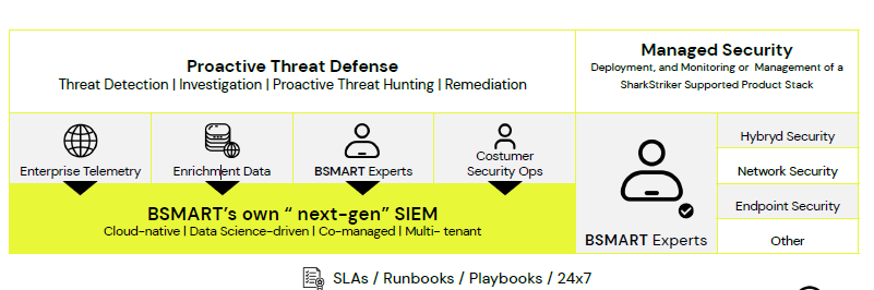 BSMART SOC as a Service perfectly blends the resources, skills, and tools to offer a robust 24/7 SOC that works as an extension to your local team. When you choose BSMART as your SOC partner, you get a host of additional benefits covering the core pillars of a SOC: people, processes, and products.